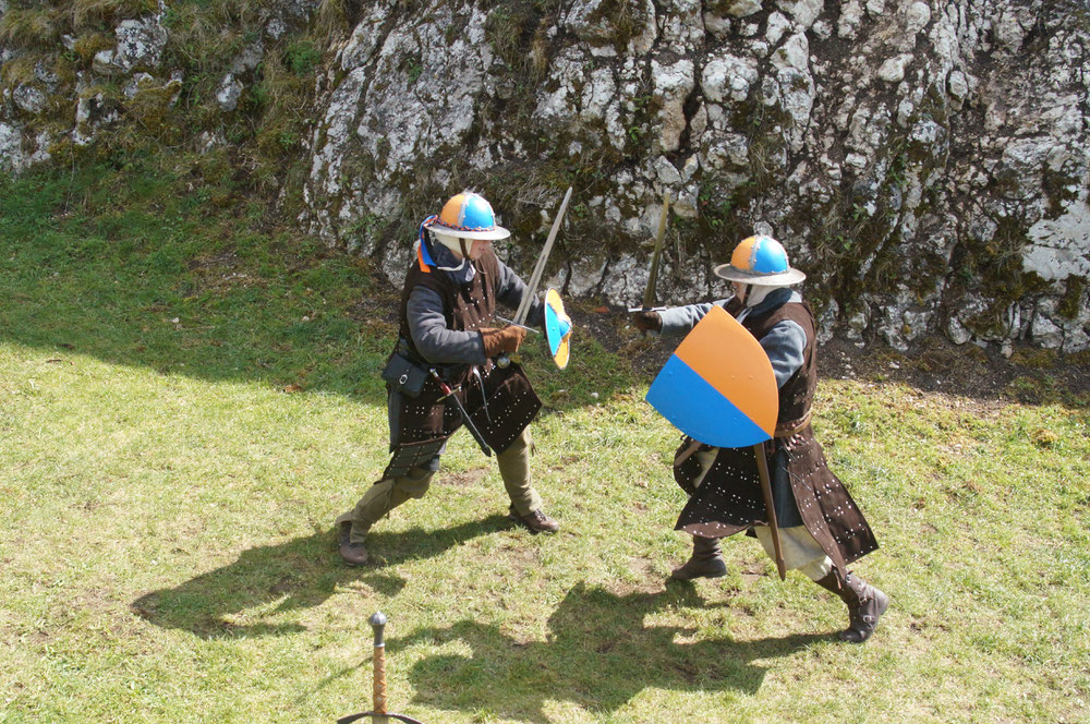 Das praktizieren verschiedene Künste des mittelalterlichen Kampfstils, darunter Langwaffen wie Speer, Hippe, Zweihandaxt, Zweihandschwert, das Lange Schwert und